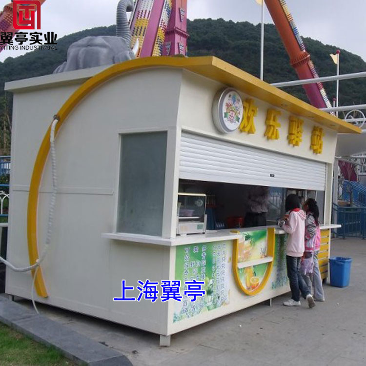 這款C型早餐售貨亭就是我們流量之星的得主了,前側售貨窗以敞開式的為主,采用的是卷簾門,售貨方便。兩側有C型裝飾條,頂部有防雨的屋檐。設計搭配非常的巧妙,整體顏色也采用白色,白色既干凈,給人的感覺就是非常的衛生,非常的適合售貨亭使用的顏色。在用黃色加以點綴,使整個售貨亭看上去更加的美觀,而且早餐售貨亭內的配置也非常的齊全,有電源,燈飾,插座,人造大理石工作,還有烤箱,冰箱等