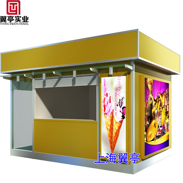 YT-S33售貨亭款式精美、整體采用鋼結構設計牢固耐用、外墻整個色彩采用華表金的氟碳漆、美觀、售貨亭結合便民商亭方便實用、外掛廣告燈箱、賣家及時把新消息展示在過路的人們。售貨窗安裝有卷簾門不但方便更能防盜。